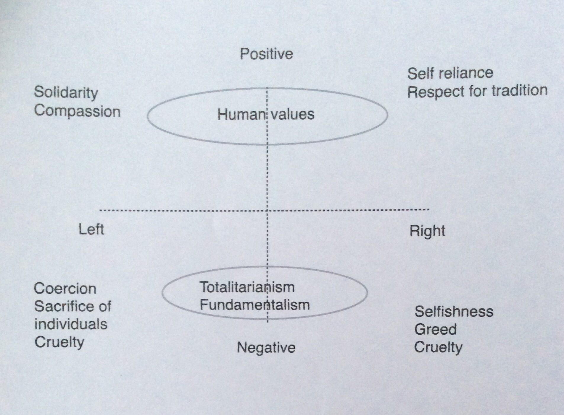 We could thus look at politics derived from human values as superseding the old left-right divisions. In fact, left and right define a dimension which is not the critical dimension for human flourishing at all and arguably never was. Both left and right have their positives but also their negatives, the latter making them almost indistinguishable at the worst extreme. The important dimension lies on another axis entirely.